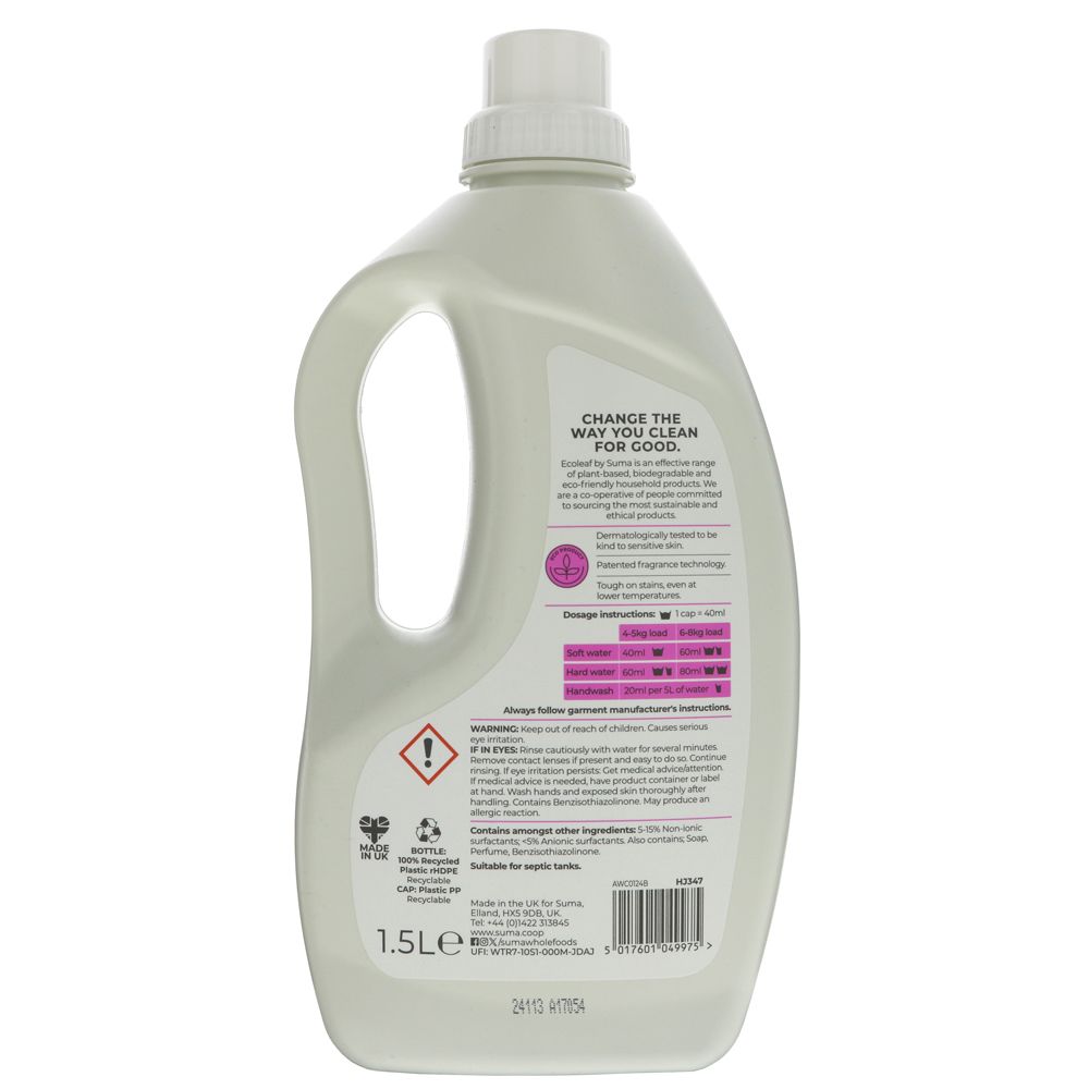 Effective yet gentle. Ecoleaf Bamboo & Lotus Flower laundry liquid is produced in the UK from plant-based ingredients, by SUMA wholefoods. Tough on stains even at lower temperatures. Best of all our Ecoleaf range is approved as cruelty free under the Leaping Bunny programme and carries the Vegan Society logo. Suitable for septic tanks. Bottle made of 100% post-consumer recycled plastic and can be recycled again. Non Bio - 37 washes This product is Vegan. Useful Information: Dosage instructions: 1 capful = 40 ml. Machine 4-5kg loads: Soft/medium water = 40 ml/ Hard water = 60 ml. 6-8kg loads: Add an extra 20 ml. Handwashing: 20 ml per 5L water. Always follow garment manufacturer's instructions.