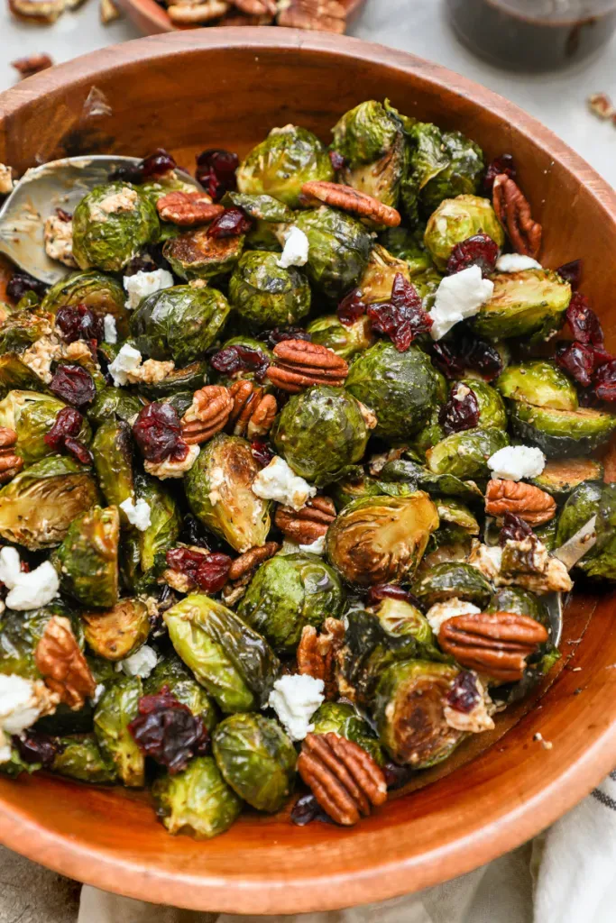 Flavor packed & ready in less than 30 minutes! Tender roasted brussel sprouts are mixed with tart cranberries & creamy goat cheese then tossed in a sweetened maple-balsamic sauce & topped with crunchy pecans. These maple-balsamic roasted brussel sprouts are a simple yet impressive side dish perfect for any occasion!
